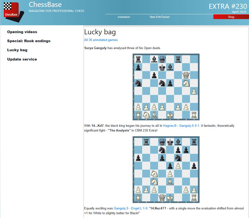 Extra #230 delivers 35 annotated games from various tournaments in the ‘Lucky bag’.