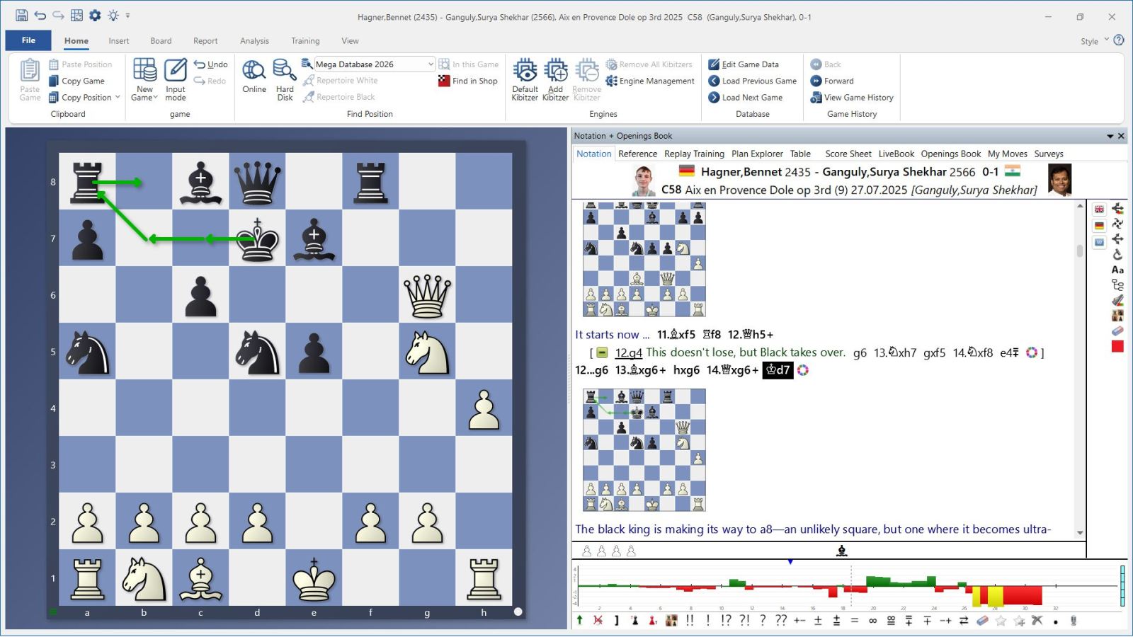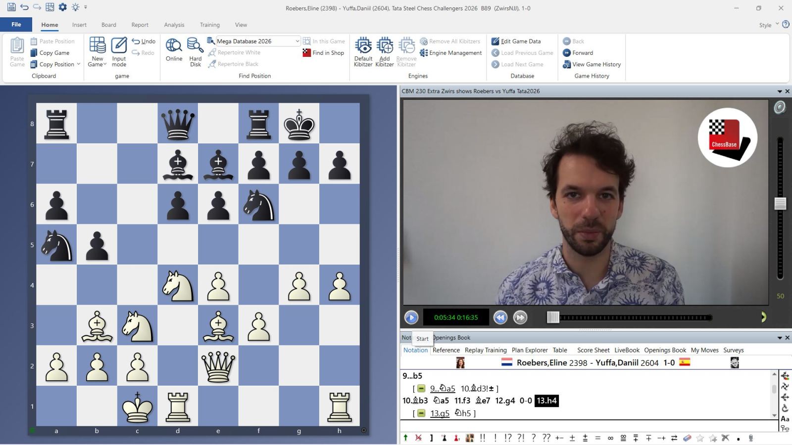 Eline Roebers had a tough time in the Challengers tournament in Wijk aan Zee at the beginning of this year. After the first four rounds, she was at the bottom of the standings with zero points. But then she managed to win an attacking victory in her typical style against one of the Elo favourites in her group, Daniil Yuffa. In the Classical Sicilian, the young Dutch IM relied on the increasingly popular 6.Bc4 and then initiated the English Attack with 0-0-0, f3, g4 and h4. In the decisive phase, she used a strong tactical motif with 24.h6 gxh6 25.g6 Rxe7 26.g7+, which not only won her an exchange, but also decisively weakened her opponent's king.
