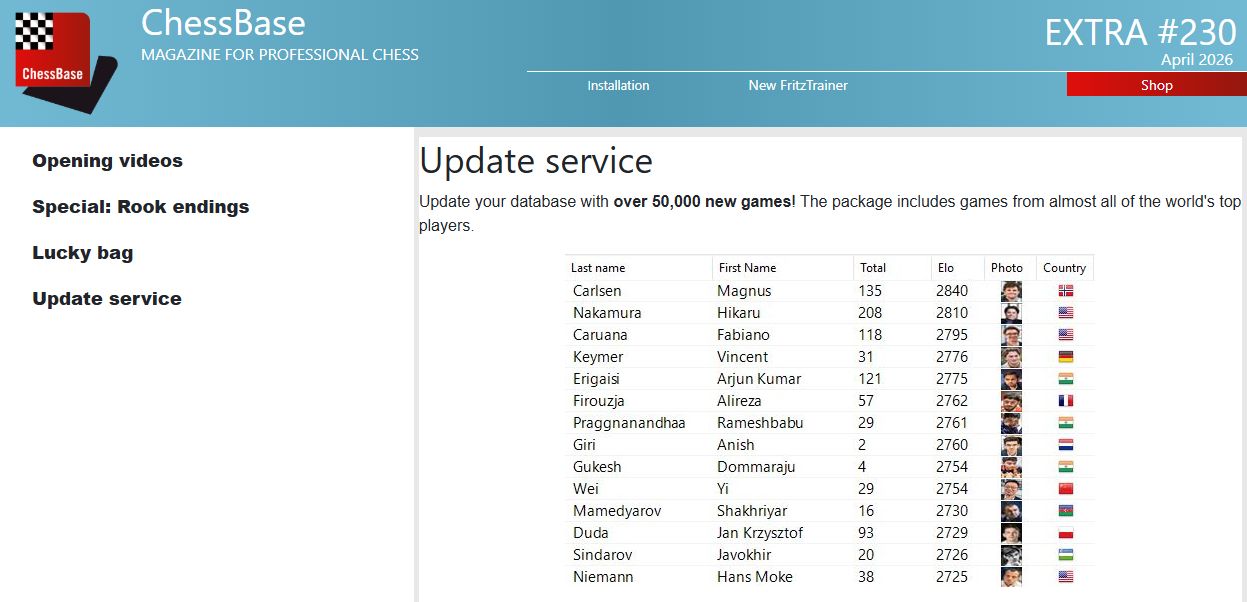 And the Update Service provides over 50,000 new games for your database! The package includes games from almost all of the world's top players.