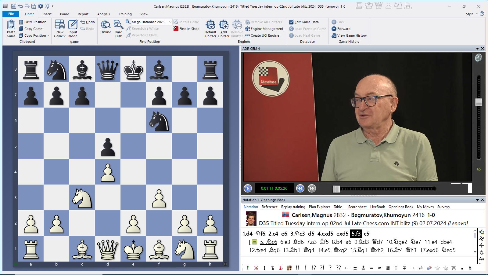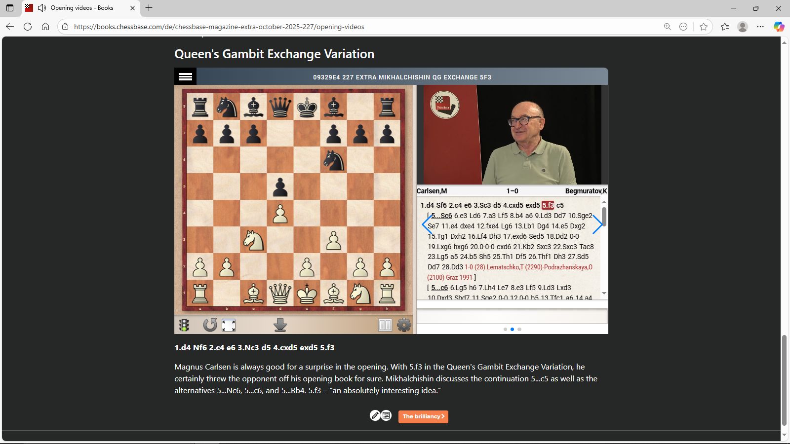 Magnus Carlsen is always good for a surprise in the opening. With 5.f3 in the Queen's Gambit Exchange Variation, he certainly threw the opponent off his opening book for sure. Mikhalchishin discusses the continuation 5...c5 as well as the alternatives 5...Nc6, 5...c6, and 5...Bb4. 5.f3 – “an absolutely interesting idea.”