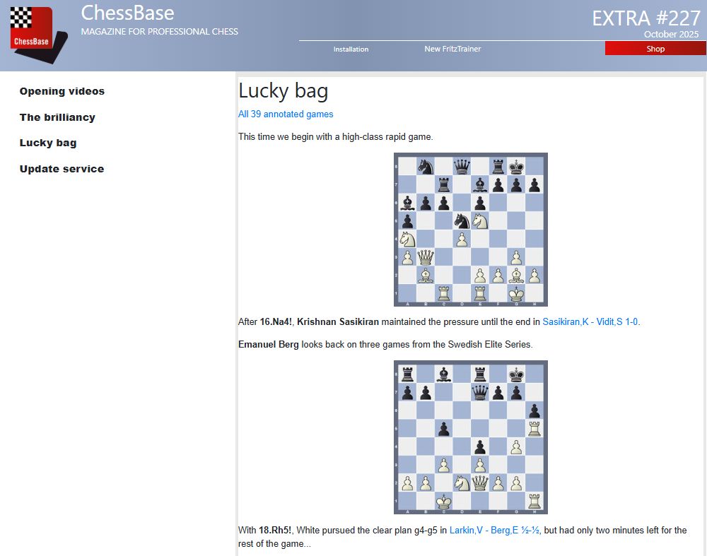 Extra #227 delivers 39 annotated games from a wide variety of tournaments in the ‘Lucky bag’.