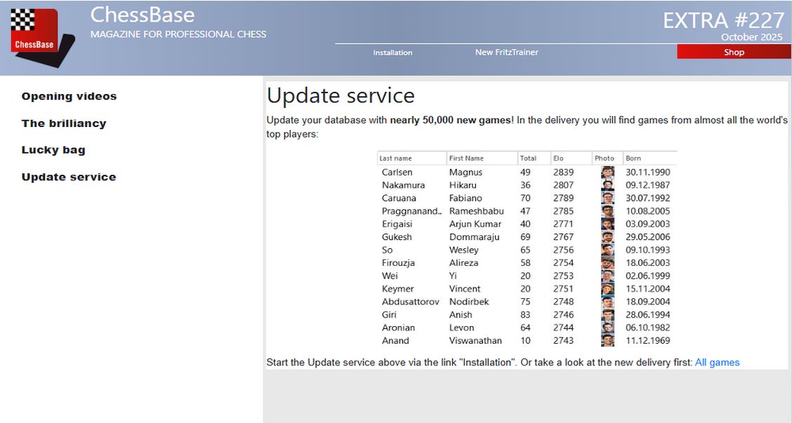 The games from the Update service are also included in the Mega Update Service 2025, which can be used with ChessBase 17/18 (and a corresponding subscription).