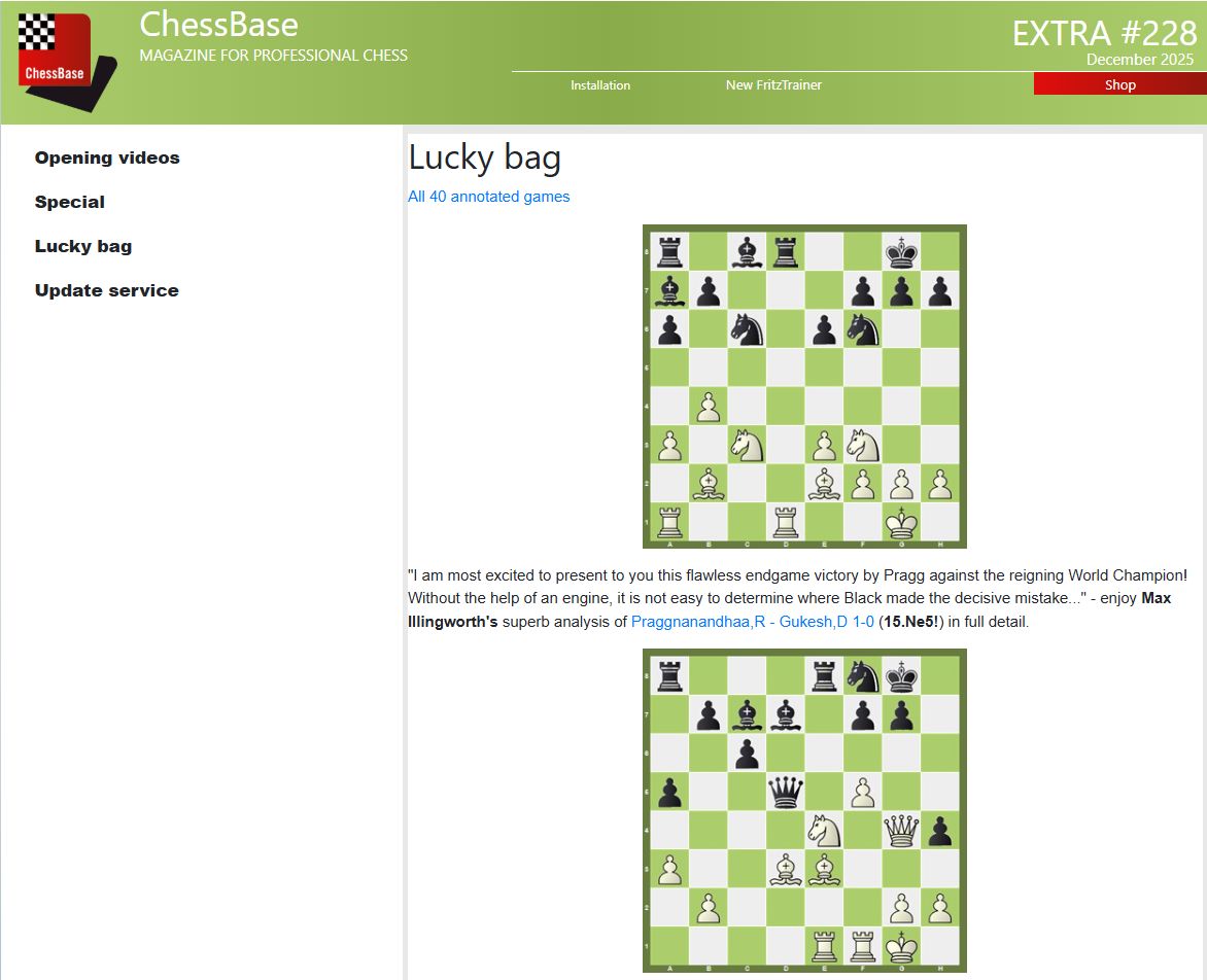 Extra #228 delivers 40 annotated games from a wide variety of tournaments in the ‘Lucky bag’.