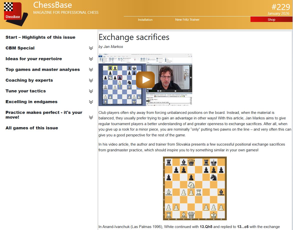 Club players often shy away from investing material in their own position with the help of an exchange sacrifice in order to gain a better perspective for the course of the game. Jan Markos wants to do something about this and presents examples of successful exchange sacrifices from master practice (games by Vishy Anand and Magnus Carlsen) in his article.