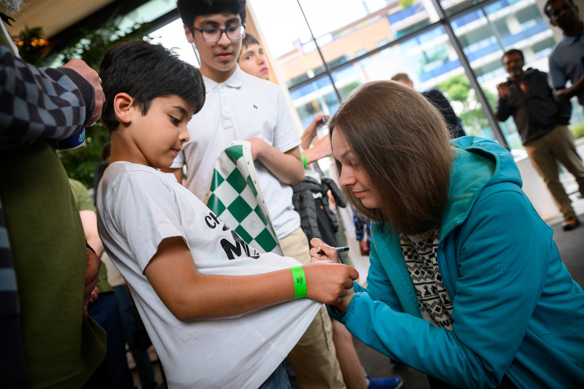 Anna Muzychuk signing a young fan's chess-themed t-shirt | Photo: Michal Walusza