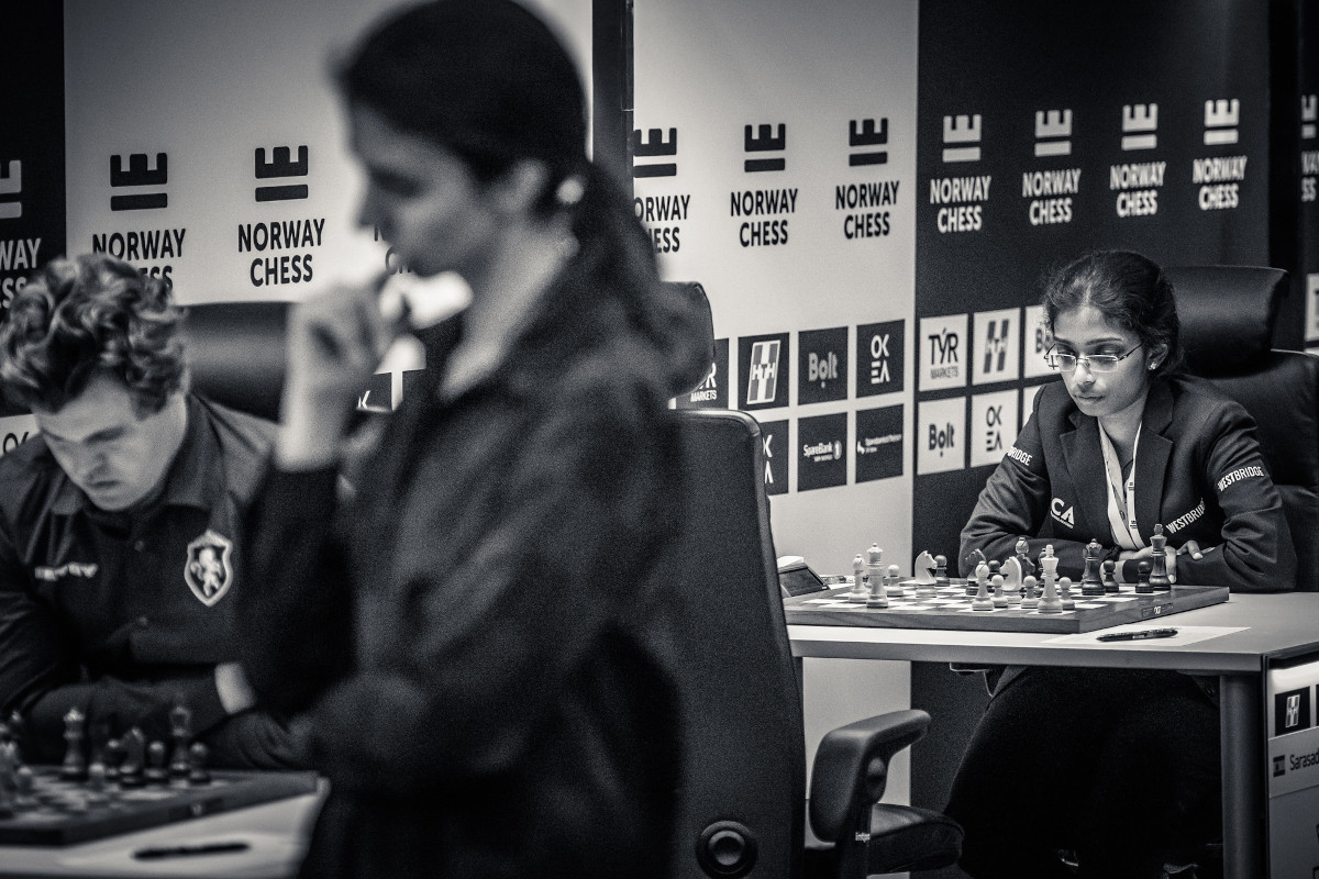 6/1/2025 – Humpy Koneru is now the sole leader of the Norway Chess Women tournament after defeating Lei Tingjie in Armageddon following a drawn classical game. Anna Muzychuk was held to a draw in both games by Ju Wenjun, allowing the women's world champion to claim 1½ point, as she stands in sole third place. In the day's only classical win, Vaishali Rameshbabu beat Sara Khadem with black to climb to fourth place in the standings. | Photo: Michal Walusza