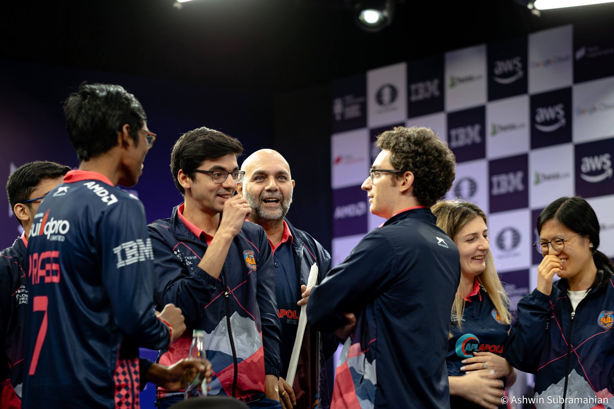 Pragg, Anish Giri, Alpine SG Pipers squad coach Pravin Thipsay, Fabiano Caruana celebrate their hard-fought ticket to the Finals, Hou Yifan and Nino Batsiashvili share a candid laugh.