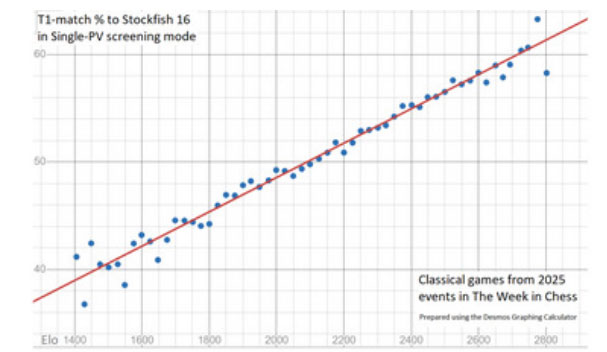 The full test uses a predictive analytic model, which means that it not only projects probabilities for every move in every position by a player of a given rating (and particular skill profile), it also puts confidence intervals on those projections. Put informally, the full test is designed to depth and precision that could enable a bookmaker to set accurate betting lines on chess moves. The analysis needed takes hours per game, however. I will stop short of its technicalities in this article, but besides my published papers with Guy Haworth and Tamal Biswas in 2011—2015, my recent presentation to the 2025 MIT Sloan Sports Analytics Conference (www.youtube.com/watch?v=6w89JIKRcNg) gives some detail and design motivation and examples. The most common outcome is not one of guilt but where the full test discerns that the player faced positions that were more forcing or clear-cut than usual. The model reflects that by giving higher probabilities for matching moves, thus projecting higher optimal move rate (and lower centipawn loss) than the broad averages used in the screening test. This results in a lower score on the z-scale, often landing in the completely normal range when the screening score was above 65.