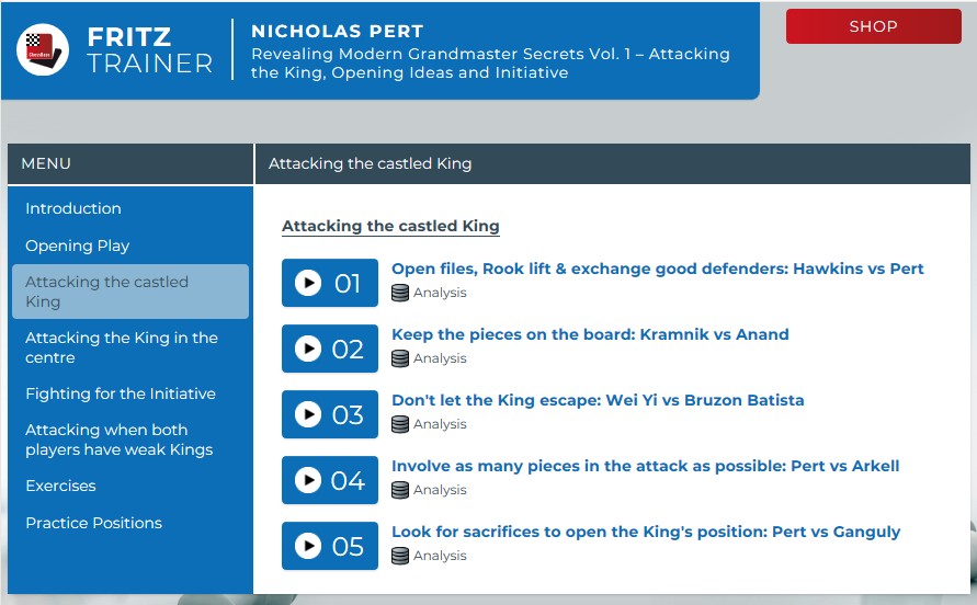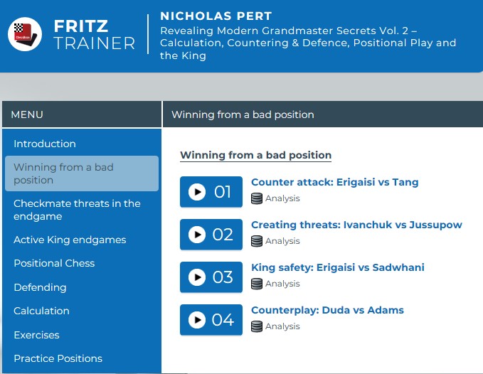 Nicholas Pert also impresses with this course. Anyone who studies the games and analyses carefully can certainly learn a great deal from grandmasters and improve their chess. I particularly like the fact that a wide range of important aspects is covered, rather than focusing on just one topic. I would recommend the course to advanced club players who want to improve their overall playing strength.