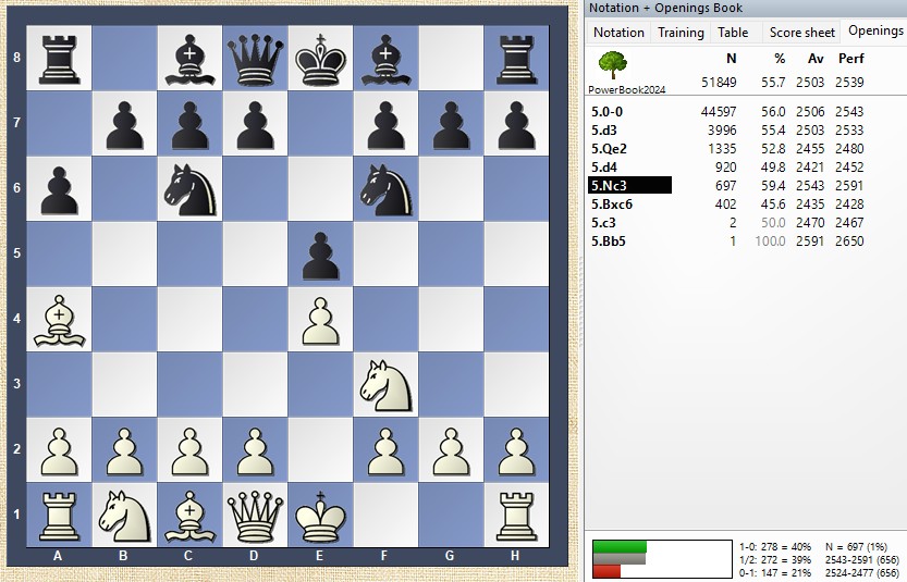 In this well-known Ruy Lopez line, White did not choose the usual move 5.0-0, but instead played 5.Nc3: