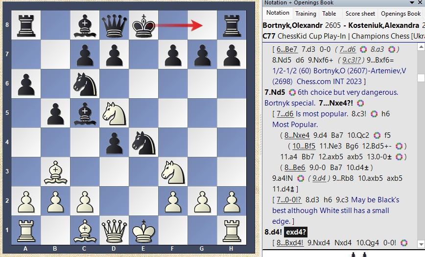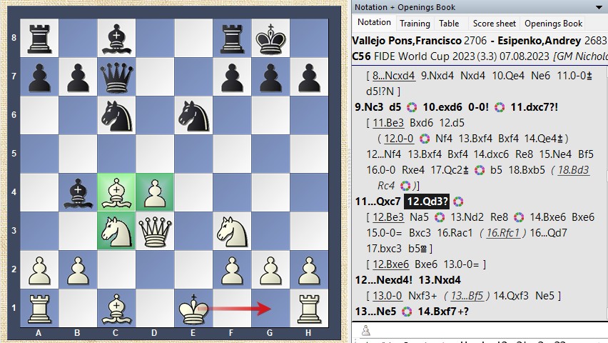 In this position, Black chose 12...Nexd4 to prevent White from bringing the king to safety by castling.