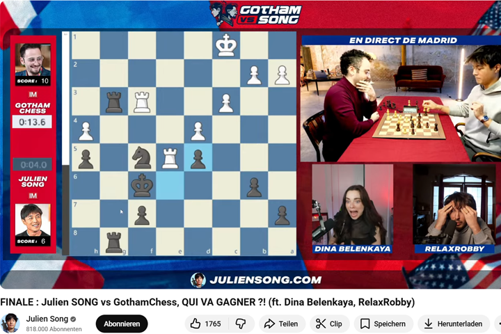 The show match between IM Levy Rozman and IM Julien Song was received largely positively by the chess community. Rozman’s play, especially in the blitz section, was praised by fans, in particular his creative tactical ideas and his eventual clear 14–8 victory over Song. The event was followed closely via live streams. Well-known commentators such as Dina Belenkaya and Relaxrobby (in French), as well as GM Felix Blohberger and Katharina Reinecke, provided fitting coverage of the match. Overall, many observers considered the event a successful, entertaining and audience-friendly encounter between two well-known chess influencers.