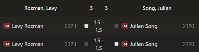 After a heated opening game in their match, International Masters Levy Rozman and Julien Song played a very precise and calm draw in their second classical encounter. Rozman chose one of his favourite openings, the Queen’s Gambit Accepted, and quickly equalised. Song looked for ways to apply pressure and won a pawn on move 41, but Rozman’s pieces were more active, and the game ended in a draw by repetition on move 53. GM Felix Blohberger and WCM Katharina Reinecke, who commented on the game on Rozman’s Twitch channel, noted that both players moved much more quickly in this game, avoiding the time trouble that had led to so many errors and turning points in the first encounter.