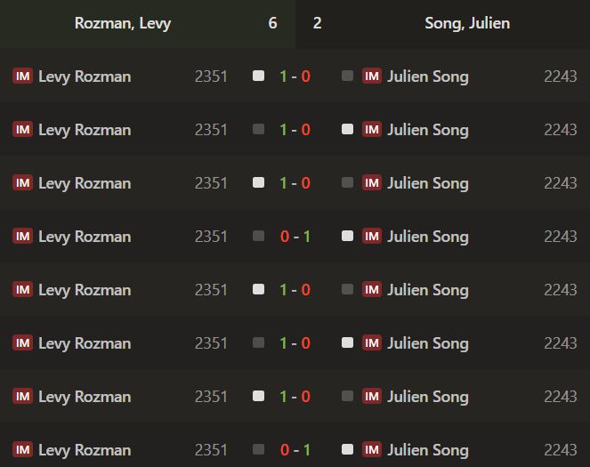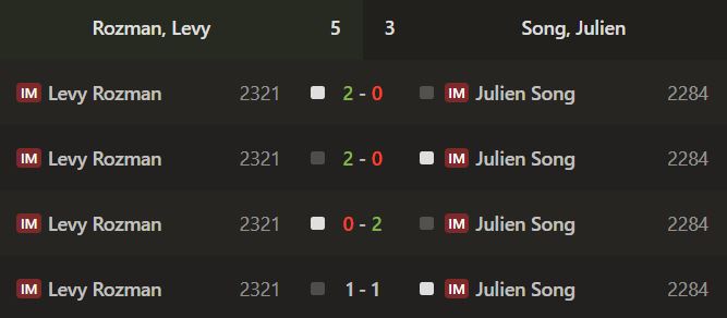 After the first two days, Song was effectively two blitz games behind. Any hopes of catching up, however, soon faded. As in the rapid section, Rozman proved to be the quicker thinker in the blitz and won the first three games. That meant Song would have had to win the next five to salvage a draw. Instead, he won only the fourth blitz game before losing the next three in a row. At least he managed to claim the very last game of the match in his favour. By then, however, Levy Rozman had already secured overall victory in the show match by 14–8.