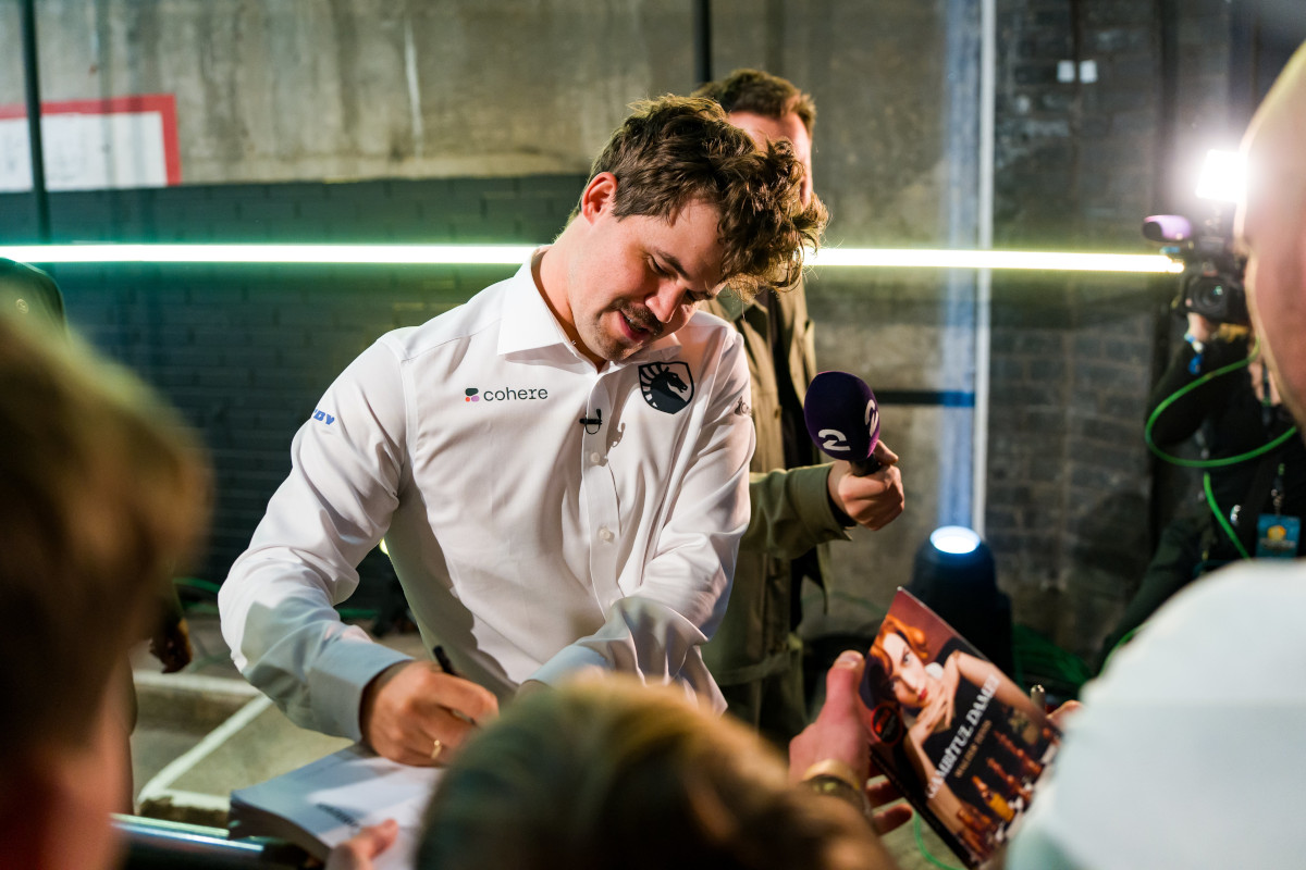 Denis Lazavik signing autographs | Photo: chess.com / Luc Bouchon