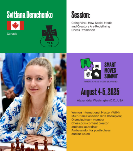 8/5/2025 – Svitlana Demchenko’s Smart Moves show began in 2021 and has produced over 120 nearly weekly episodes on topics ranging from openings and endgames to tactics and all things chess. Now, she is speaking at the World Schools Summit in Washington, DC—fittingly named the Smart Moves Summit 2025! | Photo: ChessBase India Interview