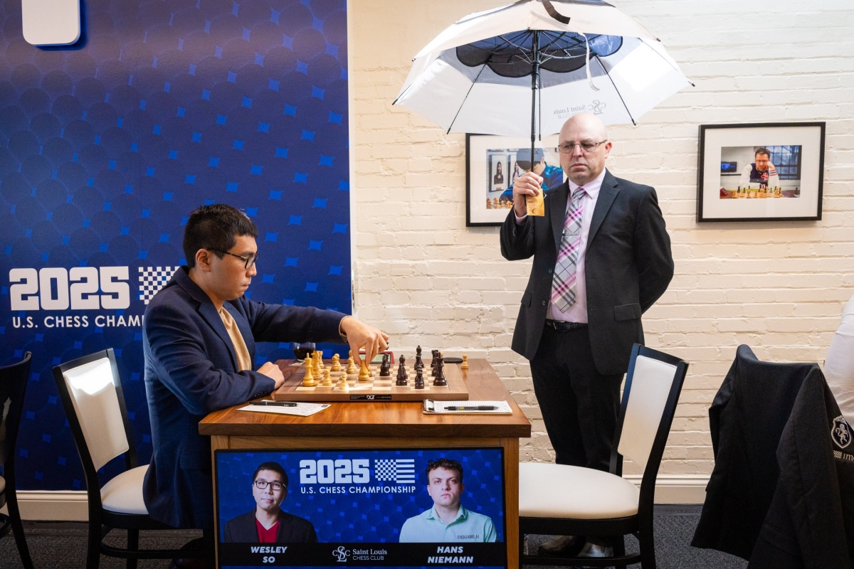 Hans Niemann also survived a major scare, as Grigoriy Oparin came close to victory before the position slipped away. Meanwhile, Levon Aronian and Awonder Liang contested the day's longest game. Aronian could have obtained an endgame a pawn up, but instead entered one a pawn down. The error was not fatal, but it made for a long evening - the game continued for 104 moves before peace was finally agreed.