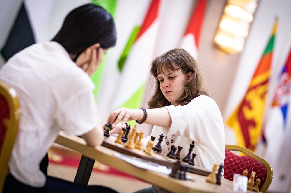 Although she felt slightly nervous in the second game because her position was not good, IM Polina Shuvalova was finally able to put away IM Gulnar Mammadova with a 100% score. After the game, Charlize van Zyl from FIDE interviewed her and asked about her evolution as a player.