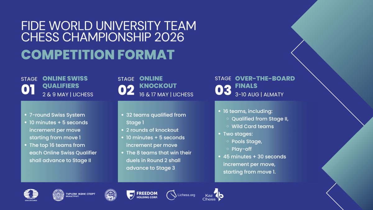 The competition has three stages. It begins with Online Swiss Qualifiers, followed by an Online Knockout stage. The over-the-board finals will then take place in Almaty from 3 to 10 August 2026.